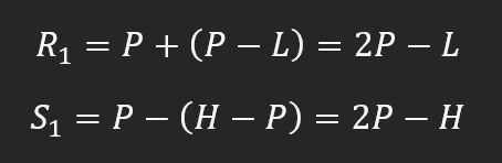 The first and most significant level of resistance (R1) and support (S1) is obtained by recognizing the lower and the upper halves of the previous trading range, which are calculated as: