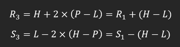 The third set of another higher resistance level (R3) and a yet lower support level (S3) is calculated by doubling the range added and subtracted from the pivot point: